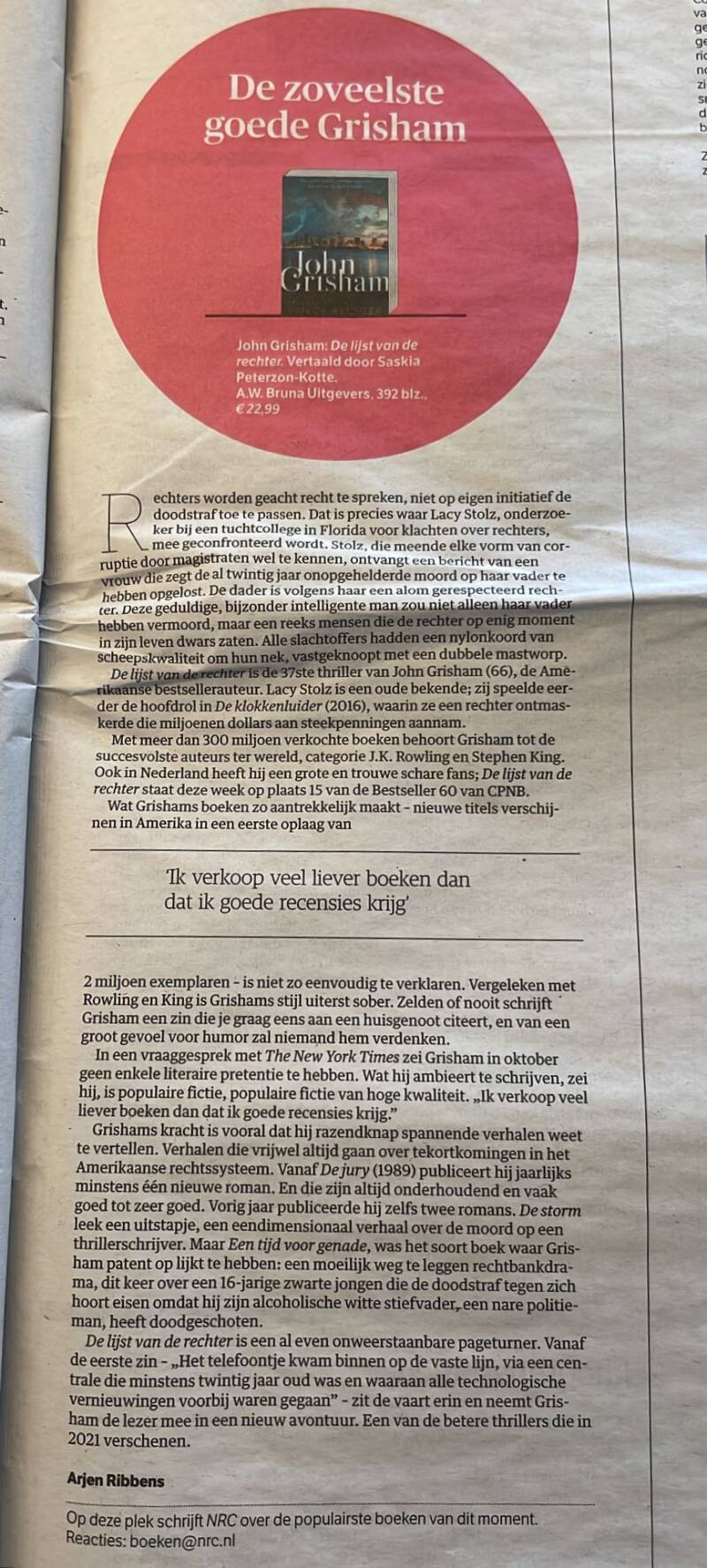 NRC 7 december 2022: Mooi artikel van Arjen Ribbens over het succes van de thrillers van John Grisham: